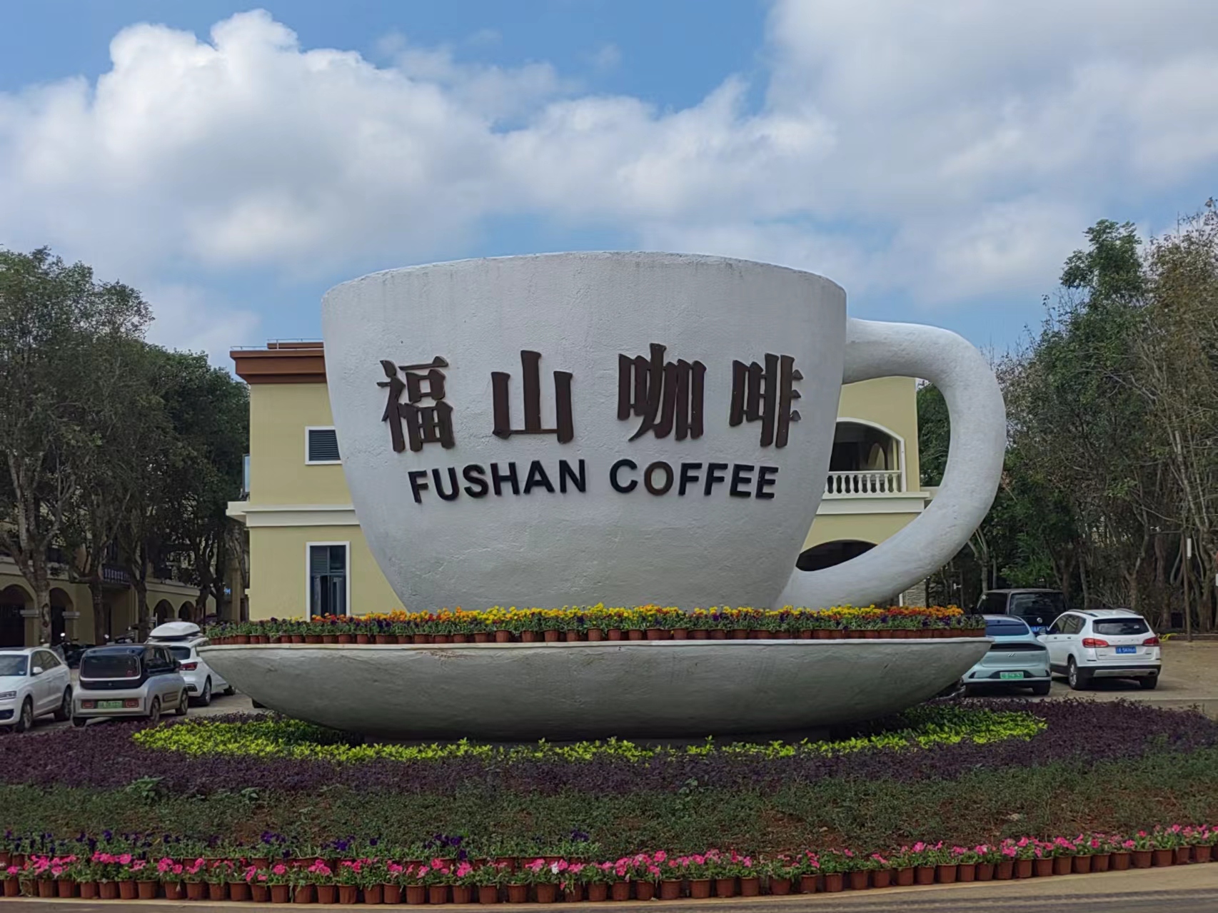 The coffee cup viewing spot is a landmark landscape of Fushan Coffee Culture and Style Town. The circumference of the coffee cup base is 30 meters, and the height of the entire coffee cup is 5.5 meters. It is decorated with local characteristic vegetation, showcasing the unique Fushan coffee culture and the meaning of longevity and prosperity. In recent years, a large number of tourists have come to Fushan Coffee Culture Town to taste coffee and actively promote Fushan coffee culture, as the saying goes, 'When you go to the mountains, your heart is filled with blessings.'.